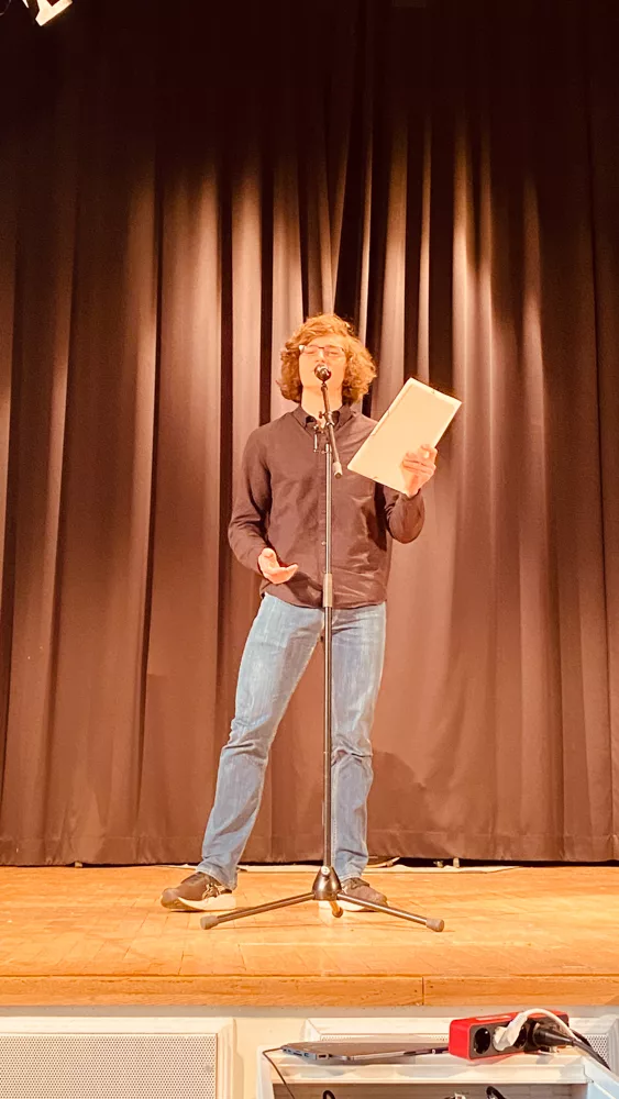 Zum diesjährigen Welttag der Philosophie wurde unsere Aula zur Bühne für einen besonderen Moment. Unter der Leitung von Matti Linke, dem Landesmeister im Poetry-Slam 2022 für Niedersachsen und Bremen, fand zunächst ein eintägiger Workshop statt, bei dem 13 Schülerinnen aus den Philosophie-Kursen der 13. Klasse eigene Texte erarbeiteten, sich gegenseitig inspirierten und herausforderten.