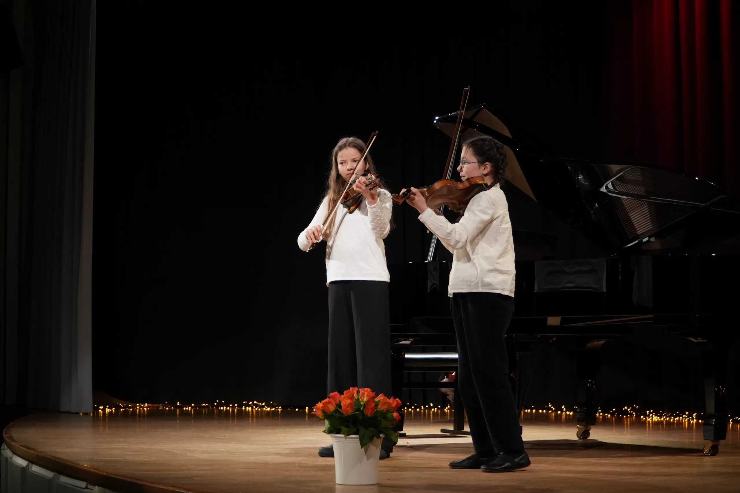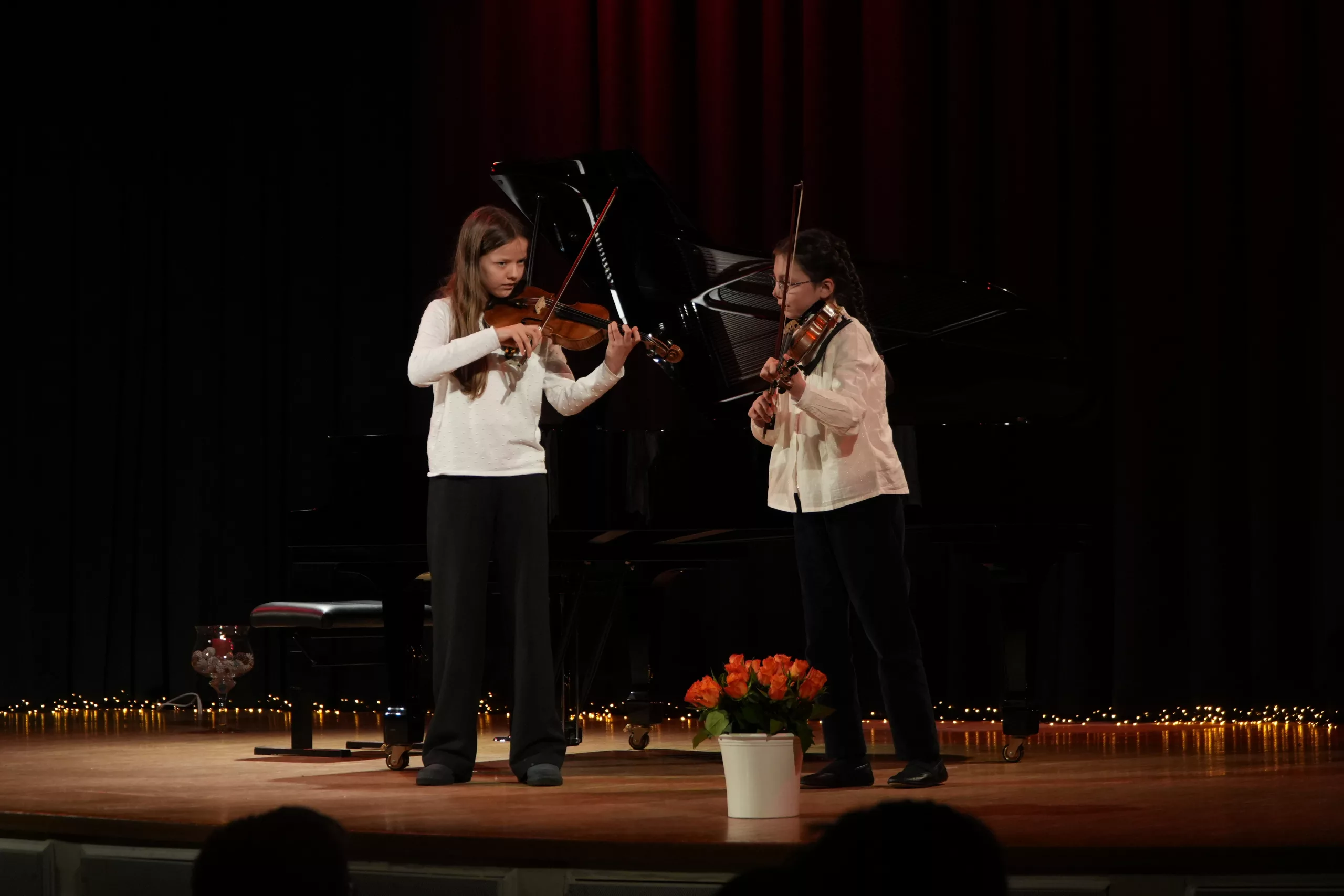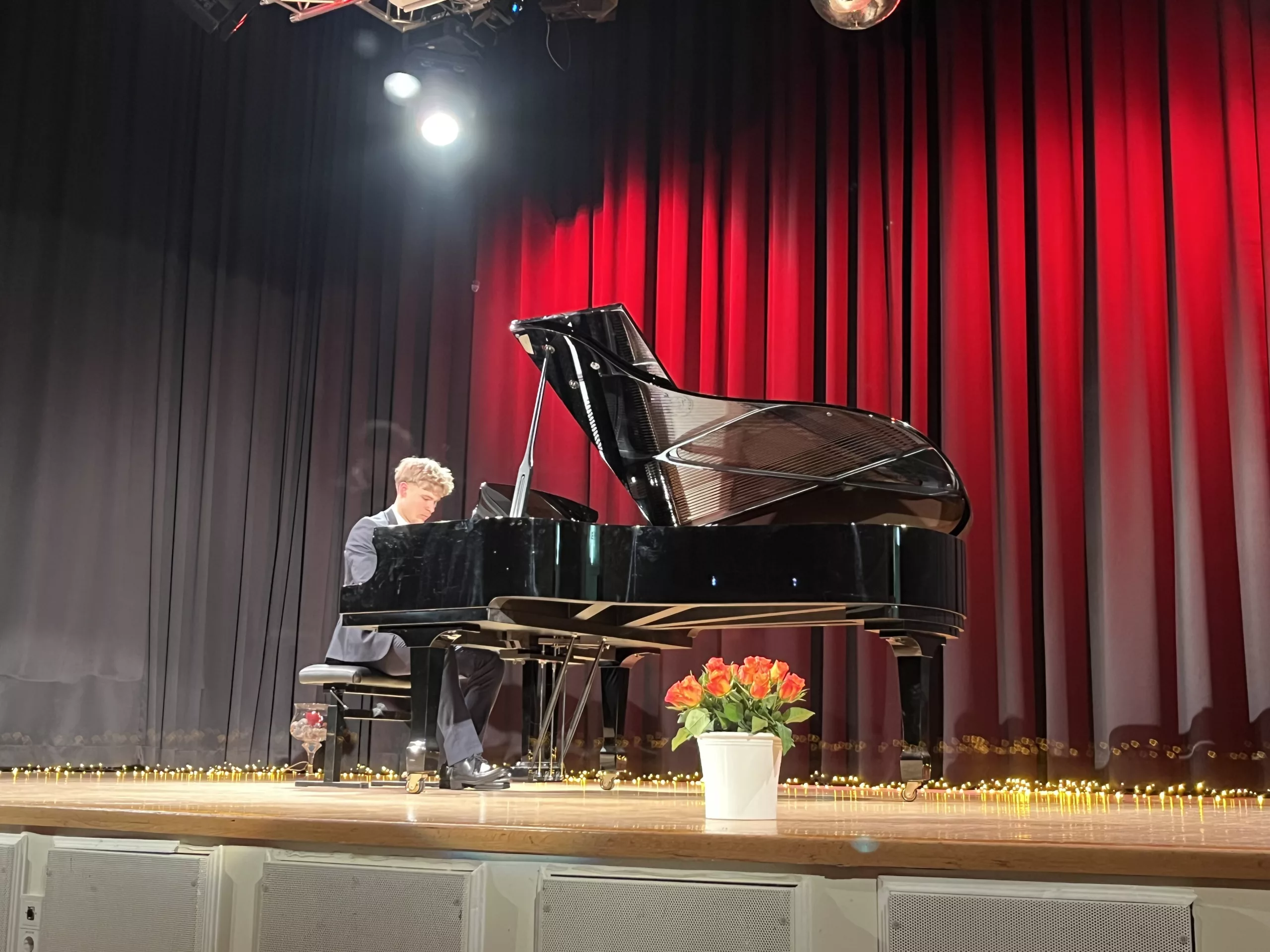 Luise Kreie und Arsenii Ovsiannik führten das Publikum durch das kurzweilige Programm. Unsere Musiklehrerin Franziska Drescher hatte seit Monaten Schüler aller Altersklassen ermuntert teilzunehmen und die Aula wieder mit Liebe zum Detail festlich geschmückt. Alle Beiträge waren ein Genuss und die Vielfalt von Streichern, Klavier und Gesang war unglaublich beeindruckend. Besonders schön war, dass für das Publikum nicht die Perfektion zählte, sondern die Begeisterung für das gewählte Stück und die Freude am Ende über die gelungene Darbietung. Wer einen Blick in das Programm wirft, kann feststellen, dass hier klassische, romantische und moderne Beiträge auf ganz hohem Niveau gezeigt wurden, die die Zuhörer sichtlich berührten. Das erklärt übrigens den Termin des Konzerts im Frühjahr, weil in diesen Wochen auch Jugend musiziert und die fachpraktische Abiturprüfung liegen.