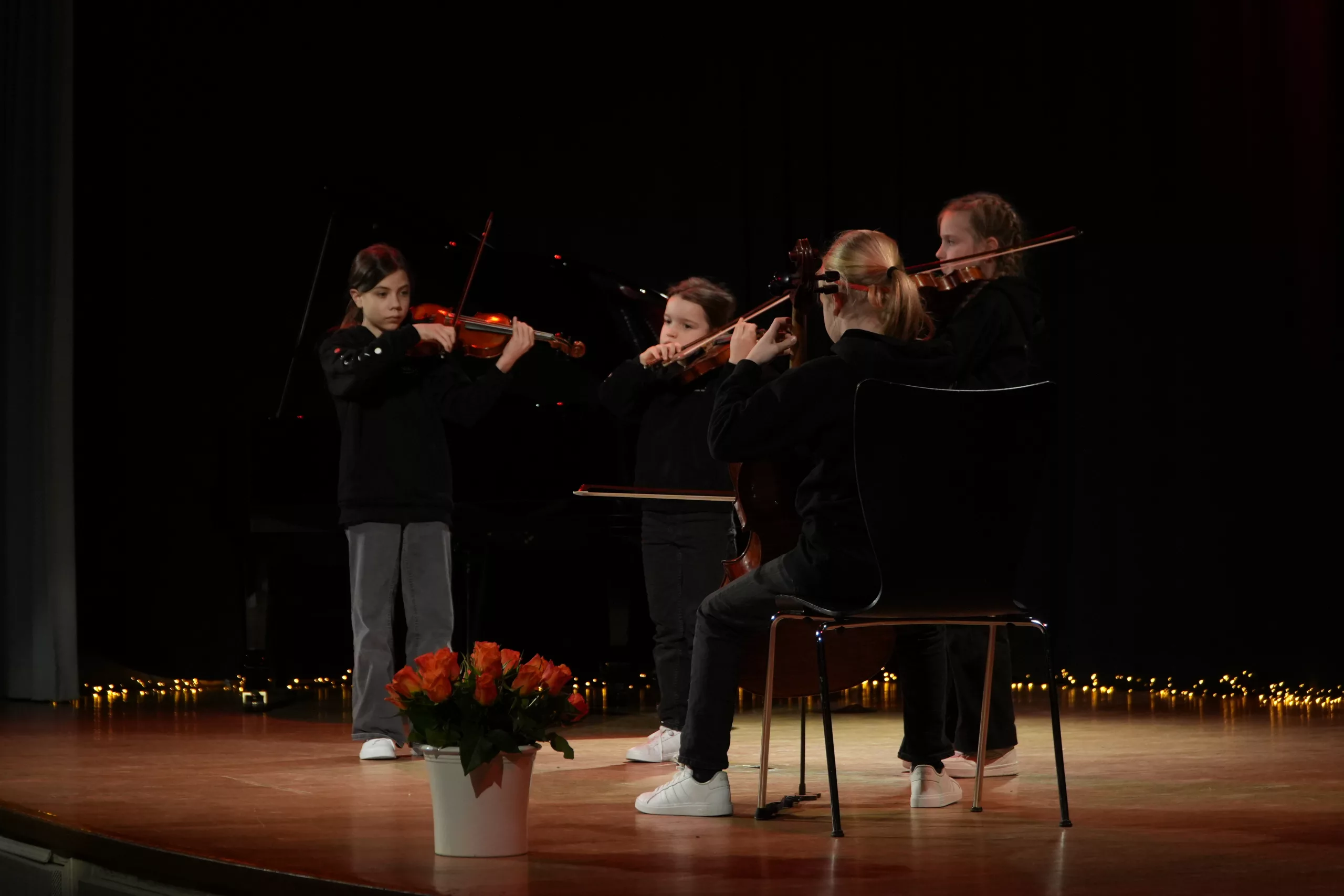 Während man die Bläserklassen und Ensembles oft auch vormittags und in den AGs proben hört, bekommt man von der Streicher-AG im Alltag weniger mit und fast nur an diesem Abend entdeckt man, wie viele Schülerinnen und Schüler ihre musikalische Begabung im Privaten pflegen.