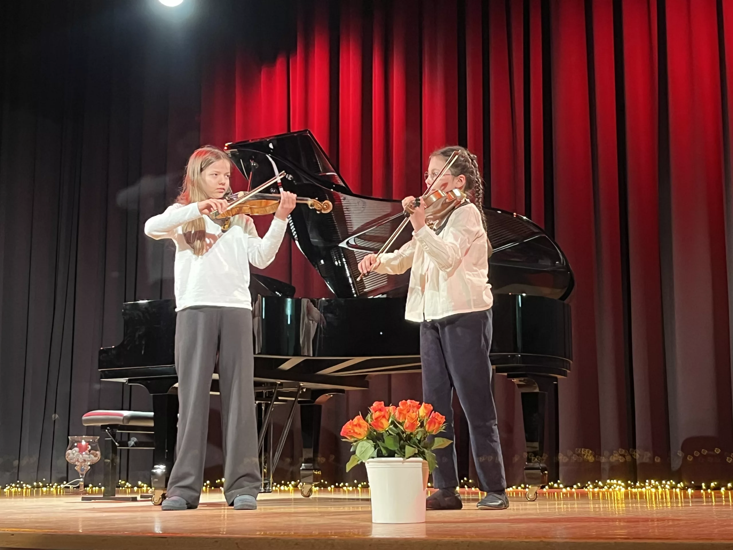Luise Kreie und Arsenii Ovsiannik führten das Publikum durch das kurzweilige Programm. Unsere Musiklehrerin Franziska Drescher hatte seit Monaten Schüler aller Altersklassen ermuntert teilzunehmen und die Aula wieder mit Liebe zum Detail festlich geschmückt. Alle Beiträge waren ein Genuss und die Vielfalt von Streichern, Klavier und Gesang war unglaublich beeindruckend. Besonders schön war, dass für das Publikum nicht die Perfektion zählte, sondern die Begeisterung für das gewählte Stück und die Freude am Ende über die gelungene Darbietung. Wer einen Blick in das Programm wirft, kann feststellen, dass hier klassische, romantische und moderne Beiträge auf ganz hohem Niveau gezeigt wurden, die die Zuhörer sichtlich berührten. Das erklärt übrigens den Termin des Konzerts im Frühjahr, weil in diesen Wochen auch Jugend musiziert und die fachpraktische Abiturprüfung liegen.