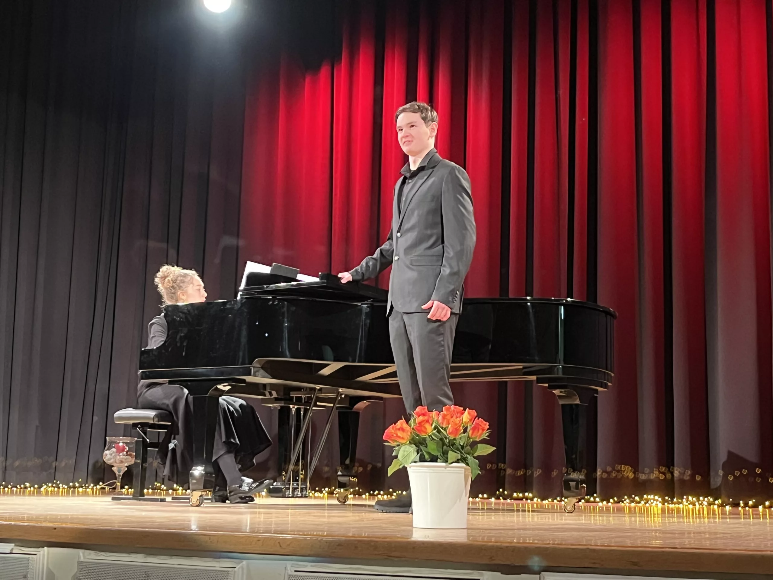 Luise Kreie und Arsenii Ovsiannik führten das Publikum durch das kurzweilige Programm. Unsere Musiklehrerin Franziska Drescher hatte seit Monaten Schüler aller Altersklassen ermuntert teilzunehmen und die Aula wieder mit Liebe zum Detail festlich geschmückt. Alle Beiträge waren ein Genuss und die Vielfalt von Streichern, Klavier und Gesang war unglaublich beeindruckend. Besonders schön war, dass für das Publikum nicht die Perfektion zählte, sondern die Begeisterung für das gewählte Stück und die Freude am Ende über die gelungene Darbietung. Wer einen Blick in das Programm wirft, kann feststellen, dass hier klassische, romantische und moderne Beiträge auf ganz hohem Niveau gezeigt wurden, die die Zuhörer sichtlich berührten. Das erklärt übrigens den Termin des Konzerts im Frühjahr, weil in diesen Wochen auch Jugend musiziert und die fachpraktische Abiturprüfung liegen.