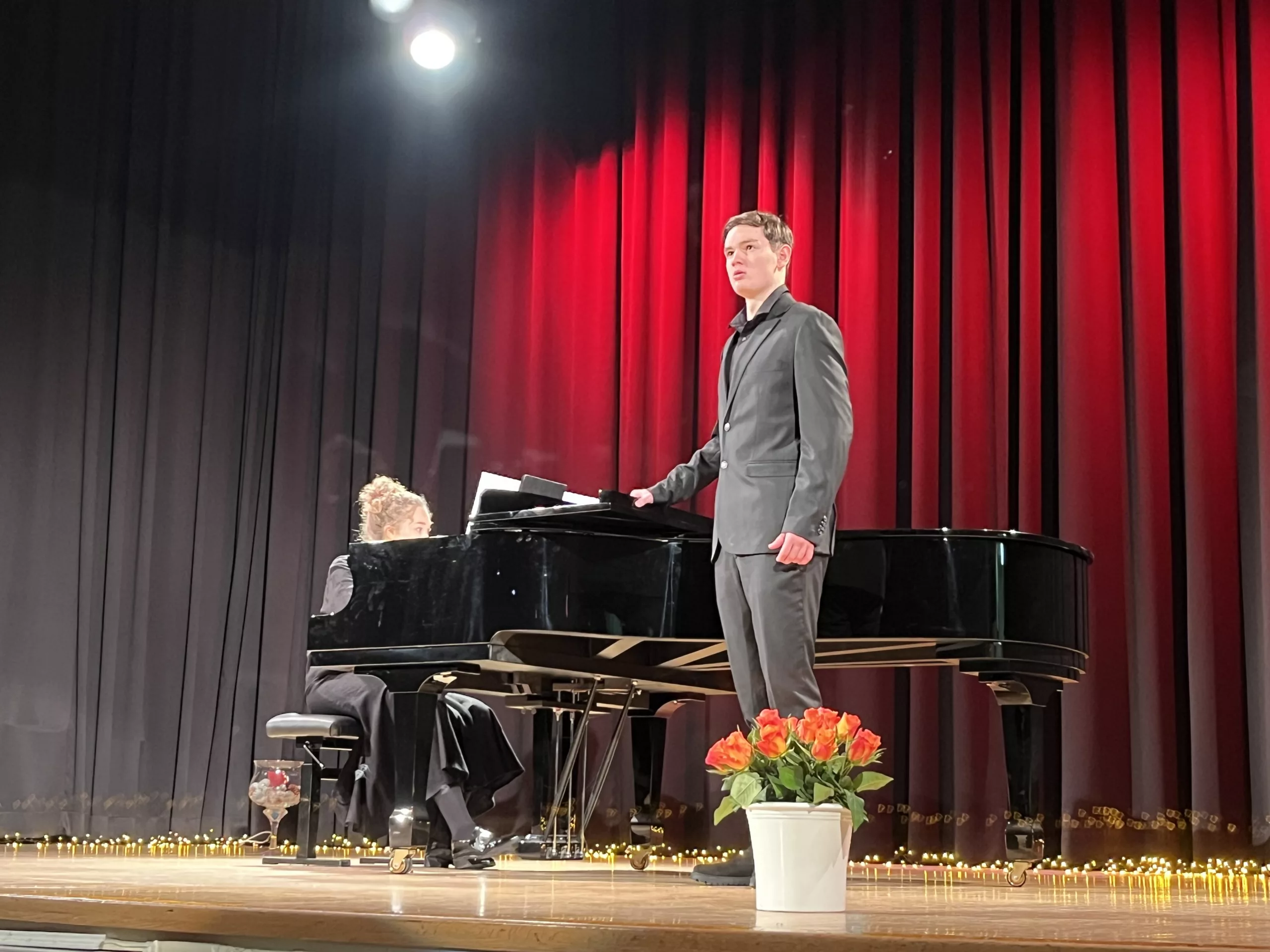 Luise Kreie und Arsenii Ovsiannik führten das Publikum durch das kurzweilige Programm. Unsere Musiklehrerin Franziska Drescher hatte seit Monaten Schüler aller Altersklassen ermuntert teilzunehmen und die Aula wieder mit Liebe zum Detail festlich geschmückt. Alle Beiträge waren ein Genuss und die Vielfalt von Streichern, Klavier und Gesang war unglaublich beeindruckend. Besonders schön war, dass für das Publikum nicht die Perfektion zählte, sondern die Begeisterung für das gewählte Stück und die Freude am Ende über die gelungene Darbietung. Wer einen Blick in das Programm wirft, kann feststellen, dass hier klassische, romantische und moderne Beiträge auf ganz hohem Niveau gezeigt wurden, die die Zuhörer sichtlich berührten. Das erklärt übrigens den Termin des Konzerts im Frühjahr, weil in diesen Wochen auch Jugend musiziert und die fachpraktische Abiturprüfung liegen.