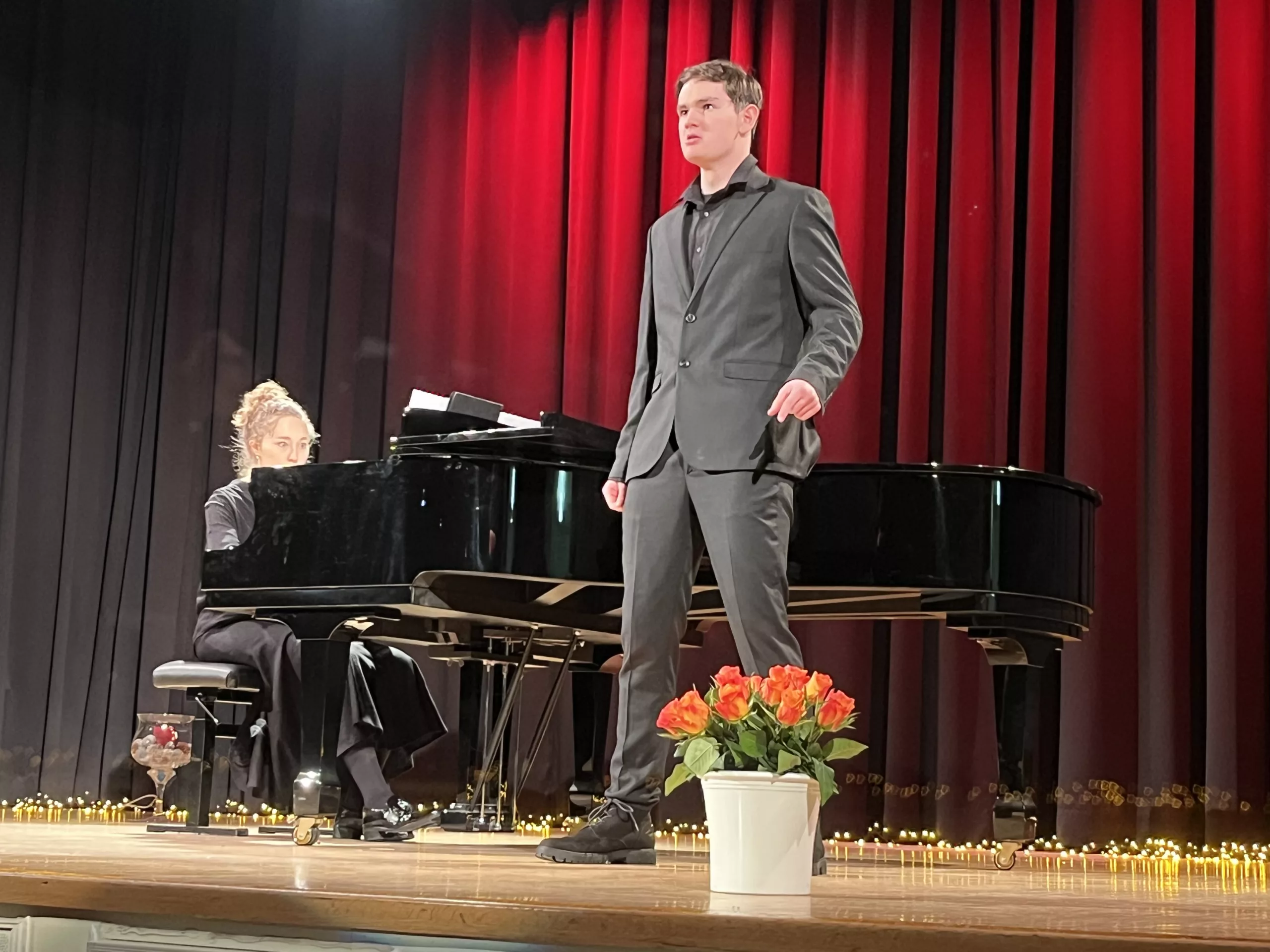 Luise Kreie und Arsenii Ovsiannik führten das Publikum durch das kurzweilige Programm. Unsere Musiklehrerin Franziska Drescher hatte seit Monaten Schüler aller Altersklassen ermuntert teilzunehmen und die Aula wieder mit Liebe zum Detail festlich geschmückt. Alle Beiträge waren ein Genuss und die Vielfalt von Streichern, Klavier und Gesang war unglaublich beeindruckend. Besonders schön war, dass für das Publikum nicht die Perfektion zählte, sondern die Begeisterung für das gewählte Stück und die Freude am Ende über die gelungene Darbietung. Wer einen Blick in das Programm wirft, kann feststellen, dass hier klassische, romantische und moderne Beiträge auf ganz hohem Niveau gezeigt wurden, die die Zuhörer sichtlich berührten. Das erklärt übrigens den Termin des Konzerts im Frühjahr, weil in diesen Wochen auch Jugend musiziert und die fachpraktische Abiturprüfung liegen.