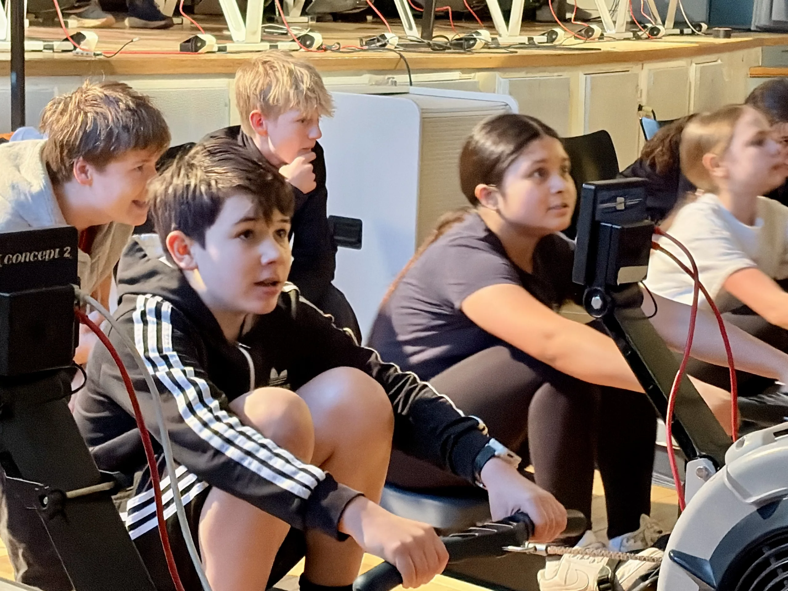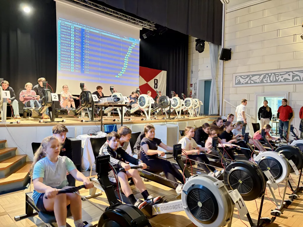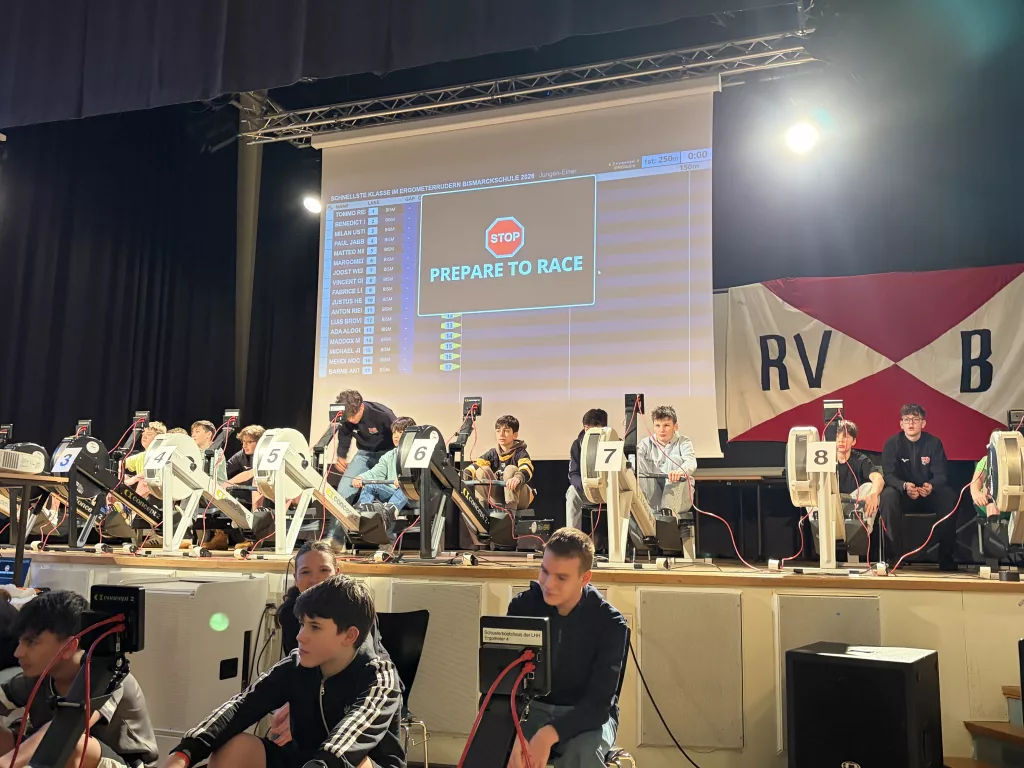 Dem Ruderverein RVB und federführend Paula Denger und ihrem Team aus 25 Helfenden ist es zu verdanken, dass die Bismarckschule nach zehn Jahren erstmals wieder an diesem bundesweiten Wettbewerb teilgenommen hat. Die Aula wurde dafür zu einer Art Bundesleistungszentrum umgebaut, mit zwei Reihen Ergometern ausgestattet, großen Leinwänden, an denen die Teilnehmer während des Wettkampfes live ihre Platzierung im Feld sehen konnten und der ganzen Technik, die man braucht, wenn 350 Sportler*innen und 600 Zuschauende zusammenkommen. Wie groß dann die Enttäuschung am Dienstagabend, als nach 12 Stunden Aufbau die Meldung kam, dass wegen Glatteis am Mittwoch die Schule ausfallen werde!
