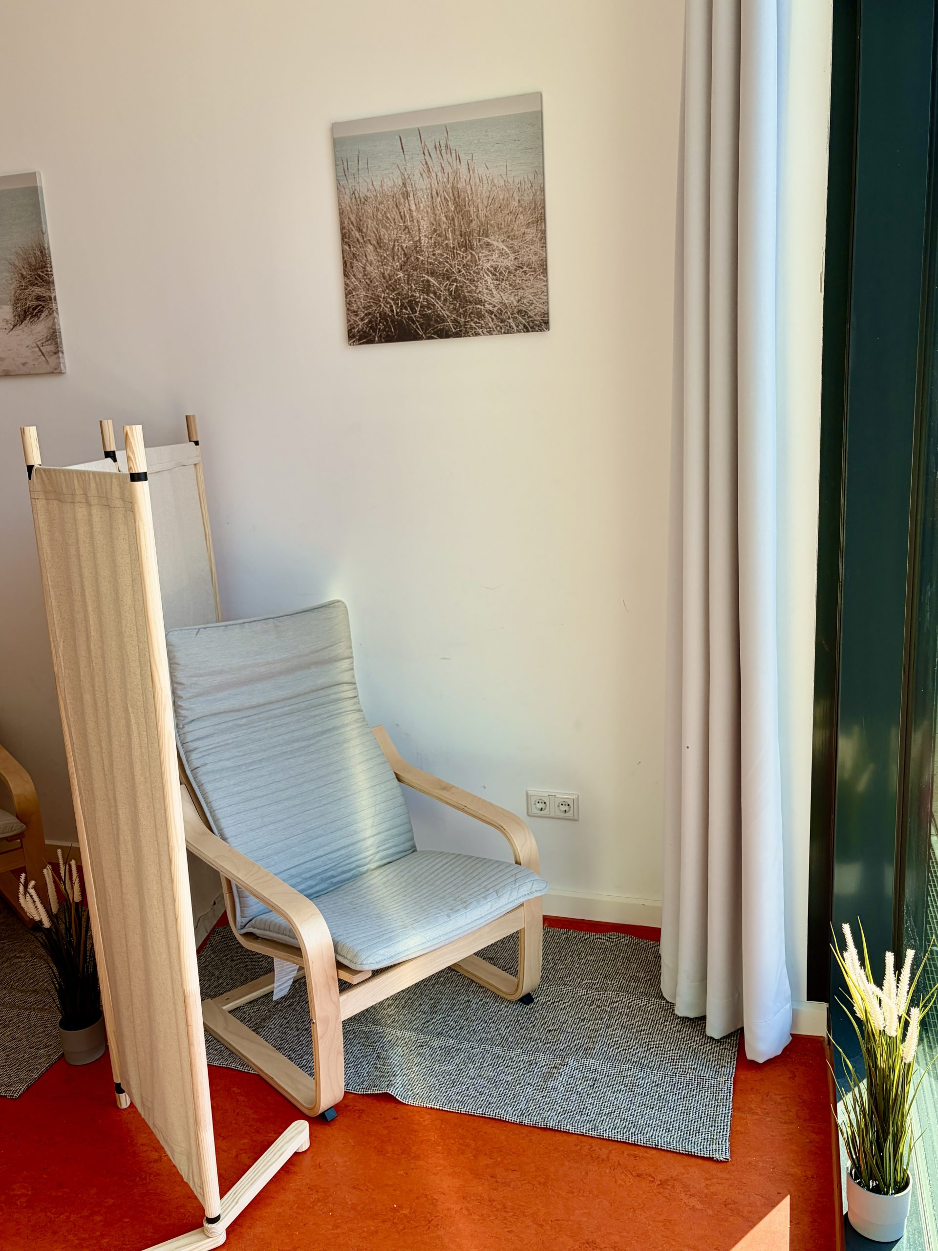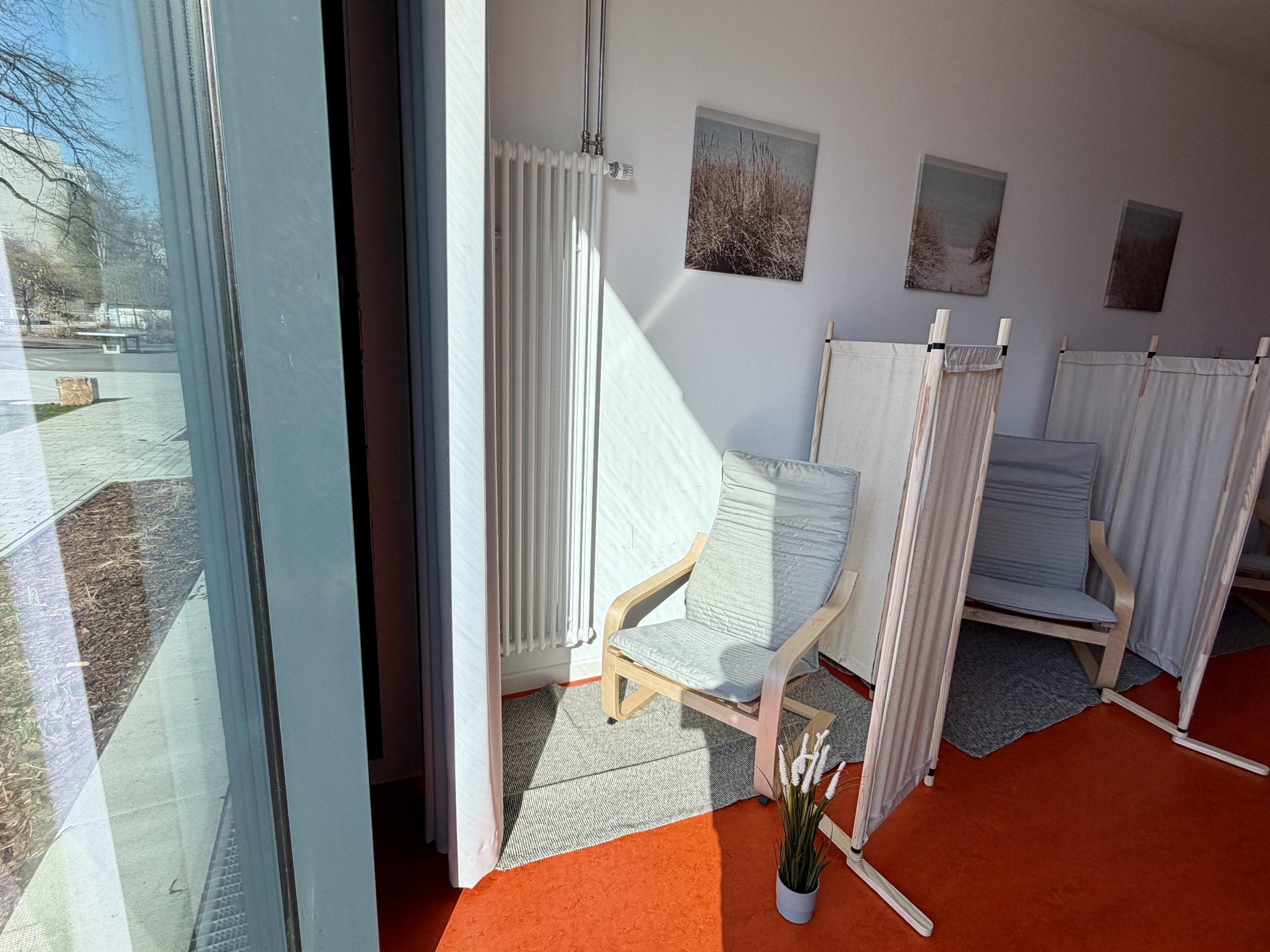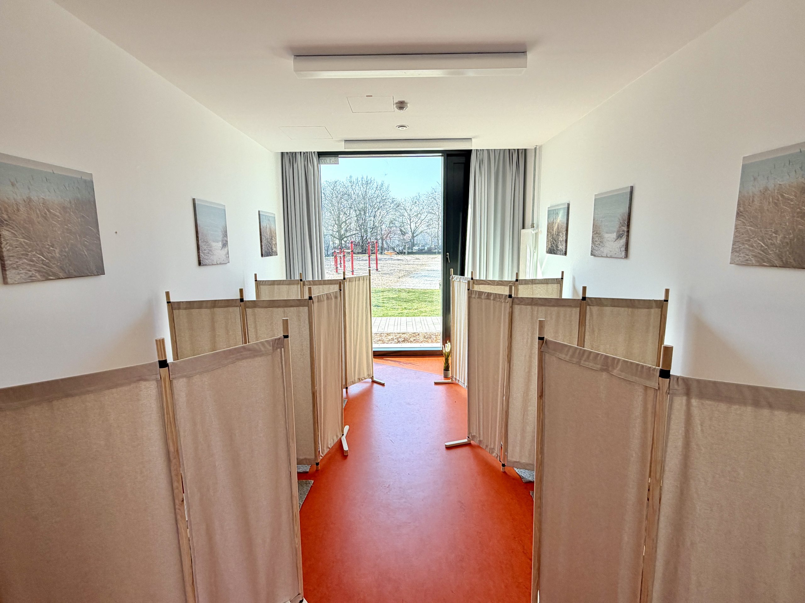 Der C-Trakt bietet nach Abschluss der Bauphase mehrere direkte Ausgänge zum Schulhof und hat im Erdgeschoss ab dieser Woche etwas ganz Besonderes: Neben dem Beratungsraum für Gespräche gibt es einen ganz neu eingerichteten Ruheraum für Schülerinnen und Schüler. Der Abiturjahrgang 2025 hat sehr großzügig Geld gespendet und die Idee für diesen Raum gleich dazu geliefert. Herr Ivanovs hat sich mit engagierten Schüler*innen um die konkrete Einrichtung gekümmert und so gibt es hier nun sechs kleine Kabinen als Rückzugsmöglichkeit für wirklich ruhige Momente, wenn jemand mal Ruhe sucht.