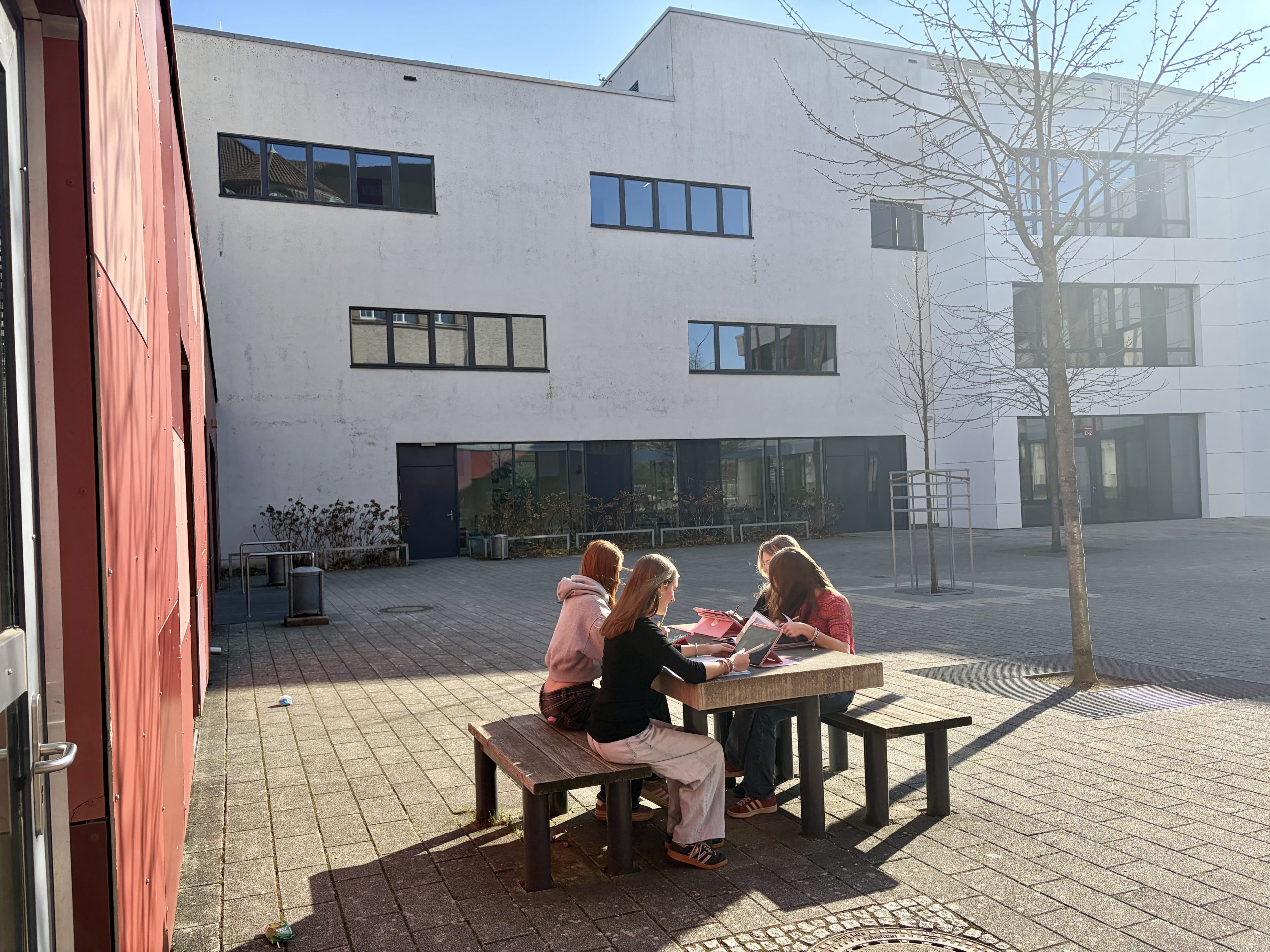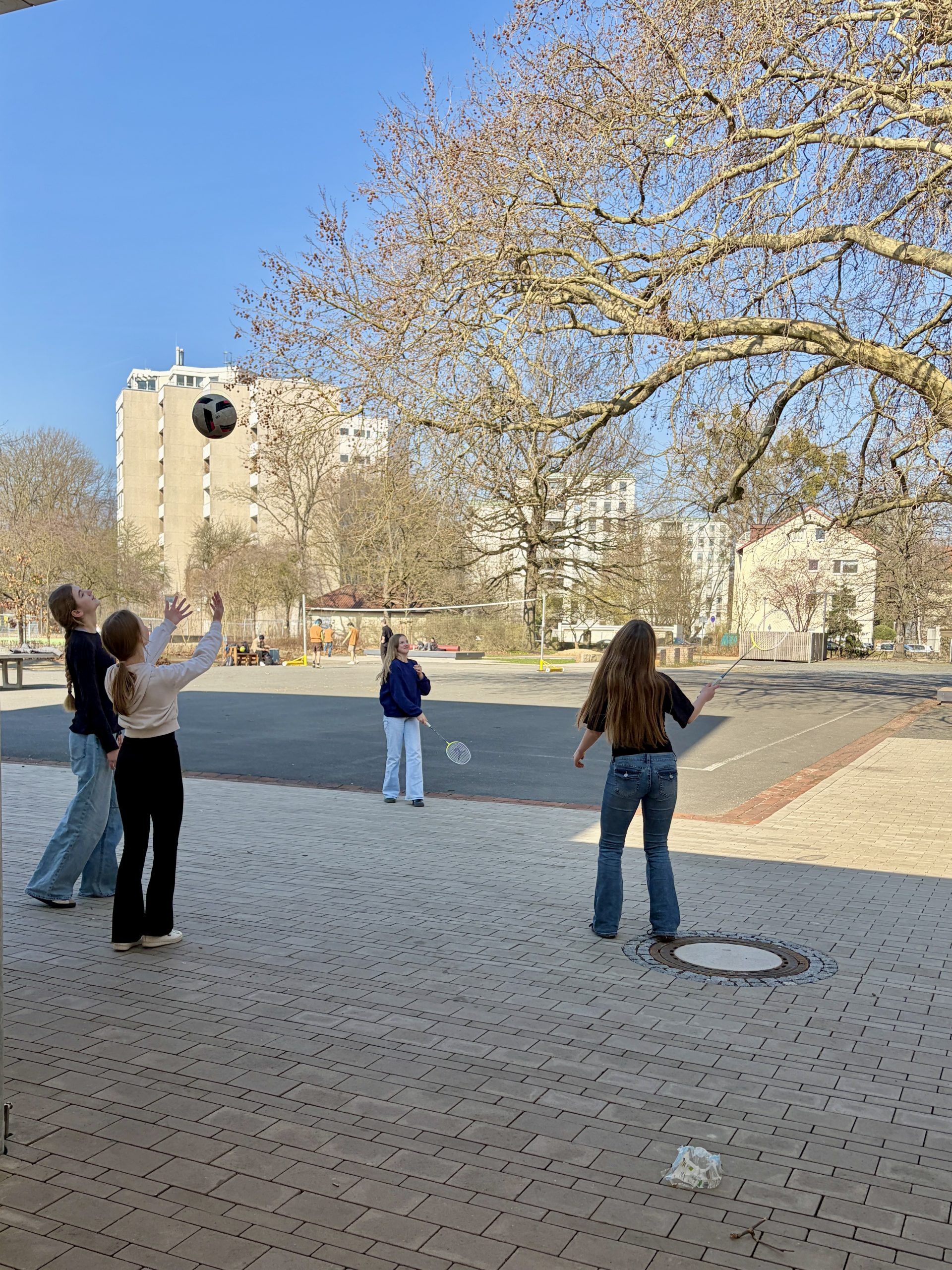 Nicht nur die Sonne lacht, weil die Bauarbeiten nun so gut wie komplett abgeschlossen sind! Unser Schulhof hat jetzt die letzten Rasenflächen und Sitzmöglichkeiten aus großen Quadersteinen bekommen und auch die Hängematten sind wieder freigegeben. Das neue Basketballfeld wird in jeder Pause genutzt, das Volleyballnetz hat den ersten Winter draußen problemlos überstanden und das große Fußballfeld ist mit neuen – und mehr! – Toren ausgestattet worden. Außerdem gibt es dort jetzt so viele Markierungen, dass mehrere Gruppen parallel Fußball spielen können – die nächste WM kann kommen 😉